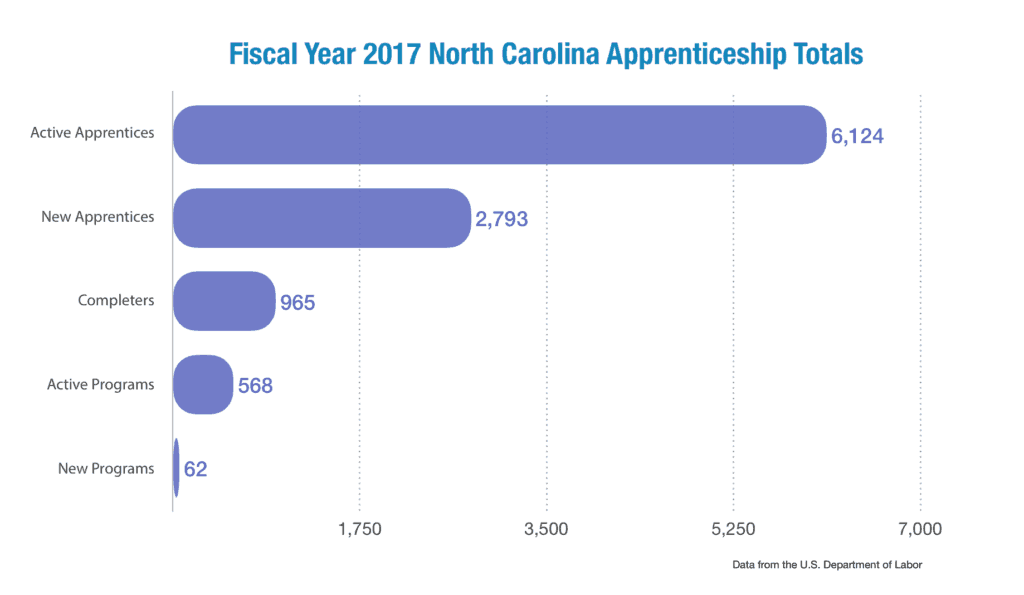 In the nationwide apprenticeship system, there are currently over 533,000 active participants. Of the many programs that operated in fiscal year 2017, there were 6,124 active apprentices in North Carolina. In comparison, South Carolina had 17,609 active apprentices.