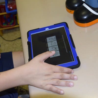 In this lesson, Milo is teaching Bradley how to recognize when someone is happy. Haynes says of working with Milo and the students, “It’s gotten easier and easier. At first, the students were scared, wondering ‘what is this?’ But now we have to do much less prompting.”