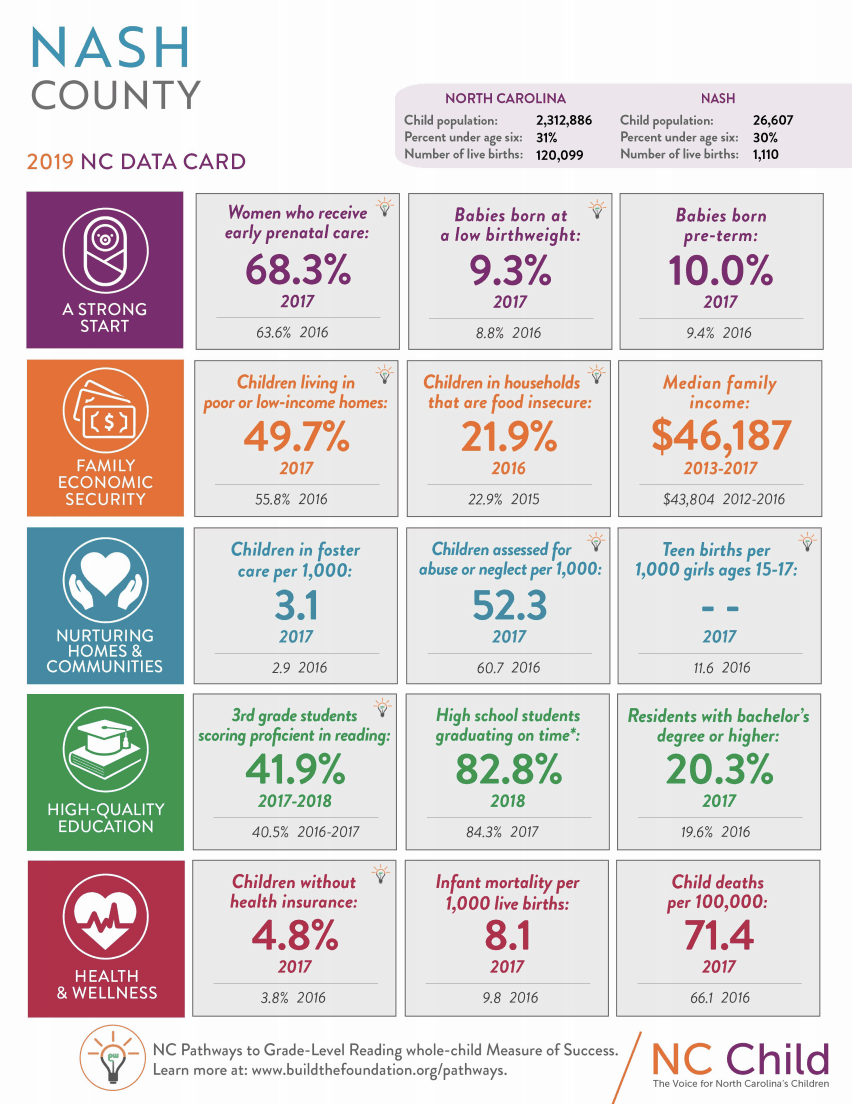 NC Child’s 2019 data cards provide snapshots on the state of health, education, and community well-being for North Carolina and for each of its 100 counties — centered around the child’s experience. That experience is quite different depending on where the child grows up. Population-level indicators “that promote children’s healthy growth and development” are split into five categories: a healthy start, family economic security, nurturing homes and communities, high-quality education, and health and wellness.