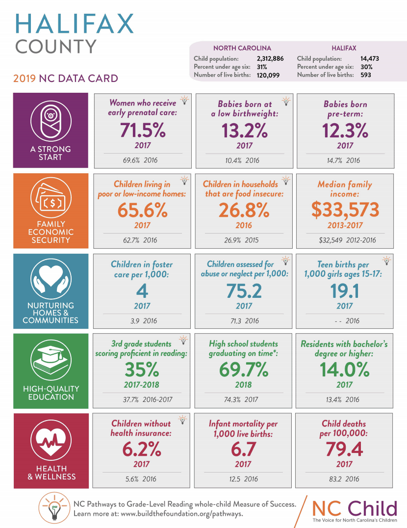 In 2017, health indicators in the counties are interesting. Wake County had over double the percentage of children without health insurance (4.6%) than Edgecombe County’s 2.1%. Halifax’s percentage of children without health insurance was even higher, at 6.2%, and Nash’s was at 4.8%. Statewide, 5.3% of children do not have health insurance. Many early childhood advocates are pushing for Medicaid expansion this legislative session with the idea that improving the health of parents improves the health of children. With the 2019 data cards, NC Child also released profiles of parents in each county that do not have health insurance because of earning too much to currently qualify for Medicaid but not enough to pay for private insurance. NC Child’s website reads: “Having parents with health insurance means that children are more likely to have health coverage, as well as better health and financial outcomes.”