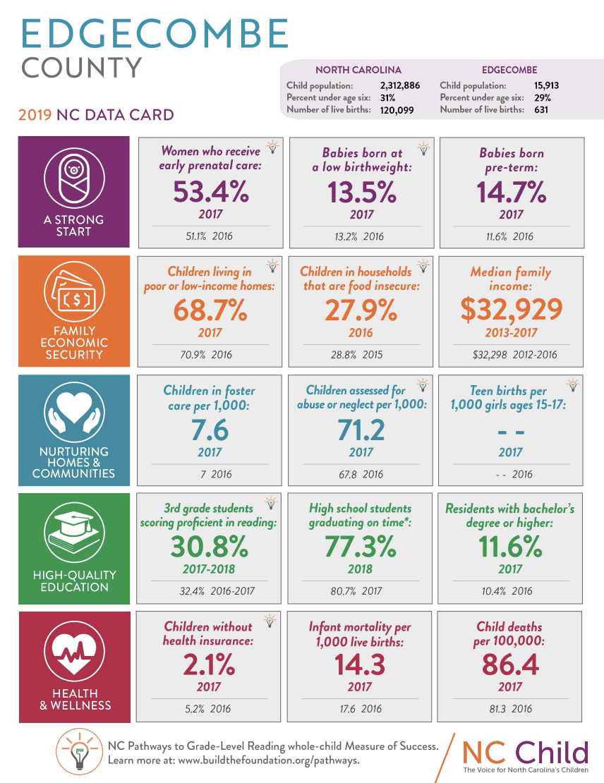 When it comes to economic security, 68.7% of young children in Edgecombe and 65.6% of young children in Halifax, live in poor or low-income families. Median household incomes are $32,929 for Edgecombe and $33,573 for Halifax. Nash County fares slightly better than its neighboring communities economically: 49.7% of young children are living in poor households and the median income is $46,187. Compare these numbers to Wake County, an hour drive to the West: 30.7% of children live in poor families, and the median income is $73,577. As mentioned above, statewide, 46.7% of children live in poor families and the median income is $50,320.