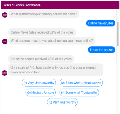 We have worked diligently with our resourceful partners at Public Input and Groundsource to make sure that all of our technology works seemlessly together. Whether you share thoughts on a Facebook post, text in, respond by email, or take a fairly standard looking survey, all of your responses go to our unique Reach NC Voices data dashboard where our reporters and researchers can comb through the data.