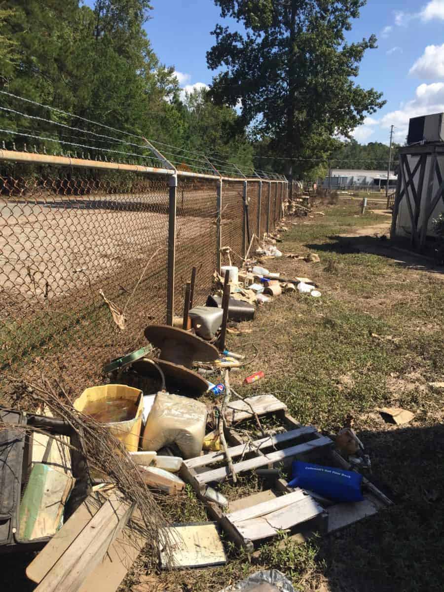 Across the street from Lumberton Junior High School, yards are piled with the remnants of people’s lives — damaged furniture, ripped-out carpet, and bags of possessions that are now trash. A long line snakes around the back of the high school with people waiting to pick up food, toiletries, and other basic necessities. The volunteers at the school tell us they are running out of cleaning supplies.