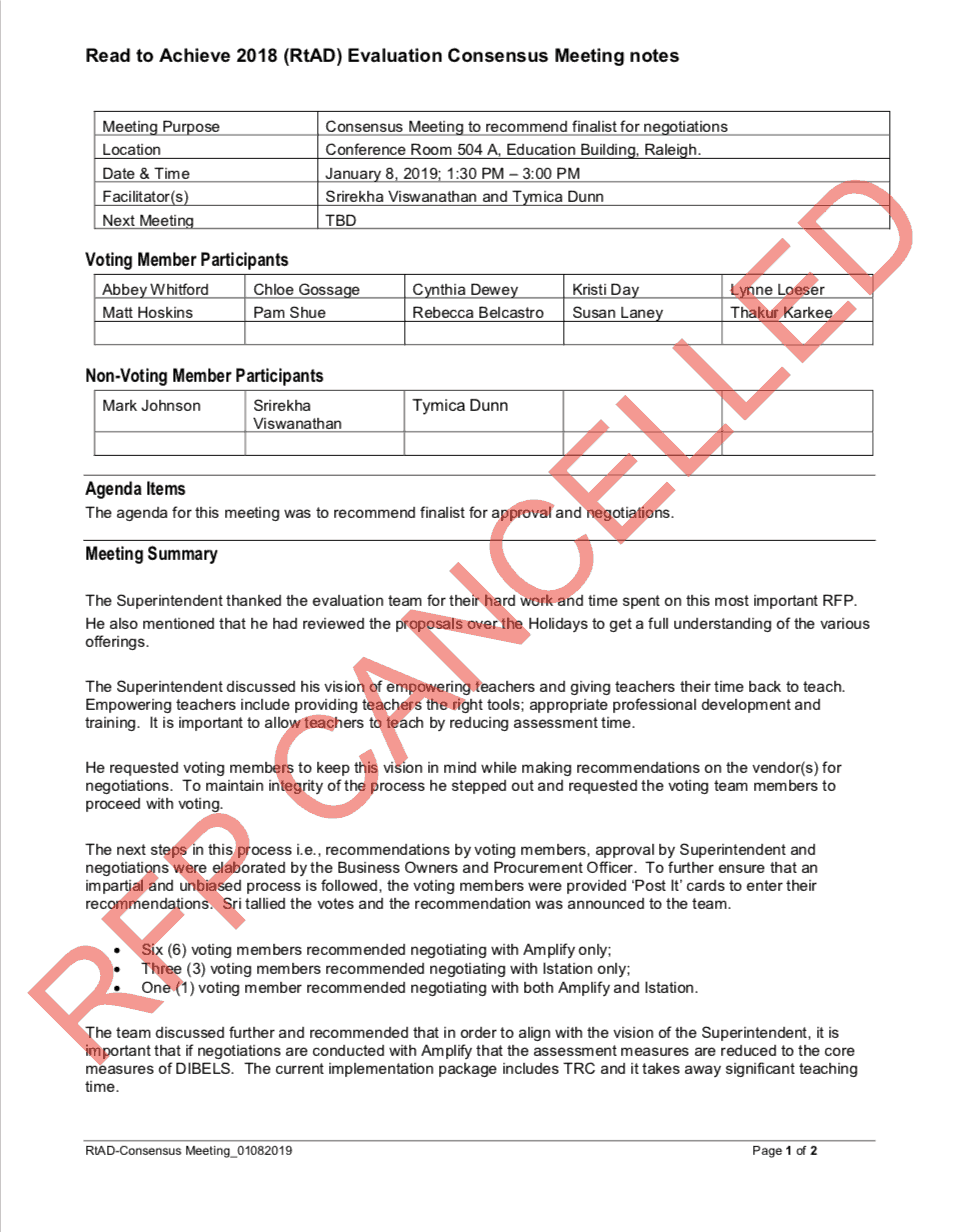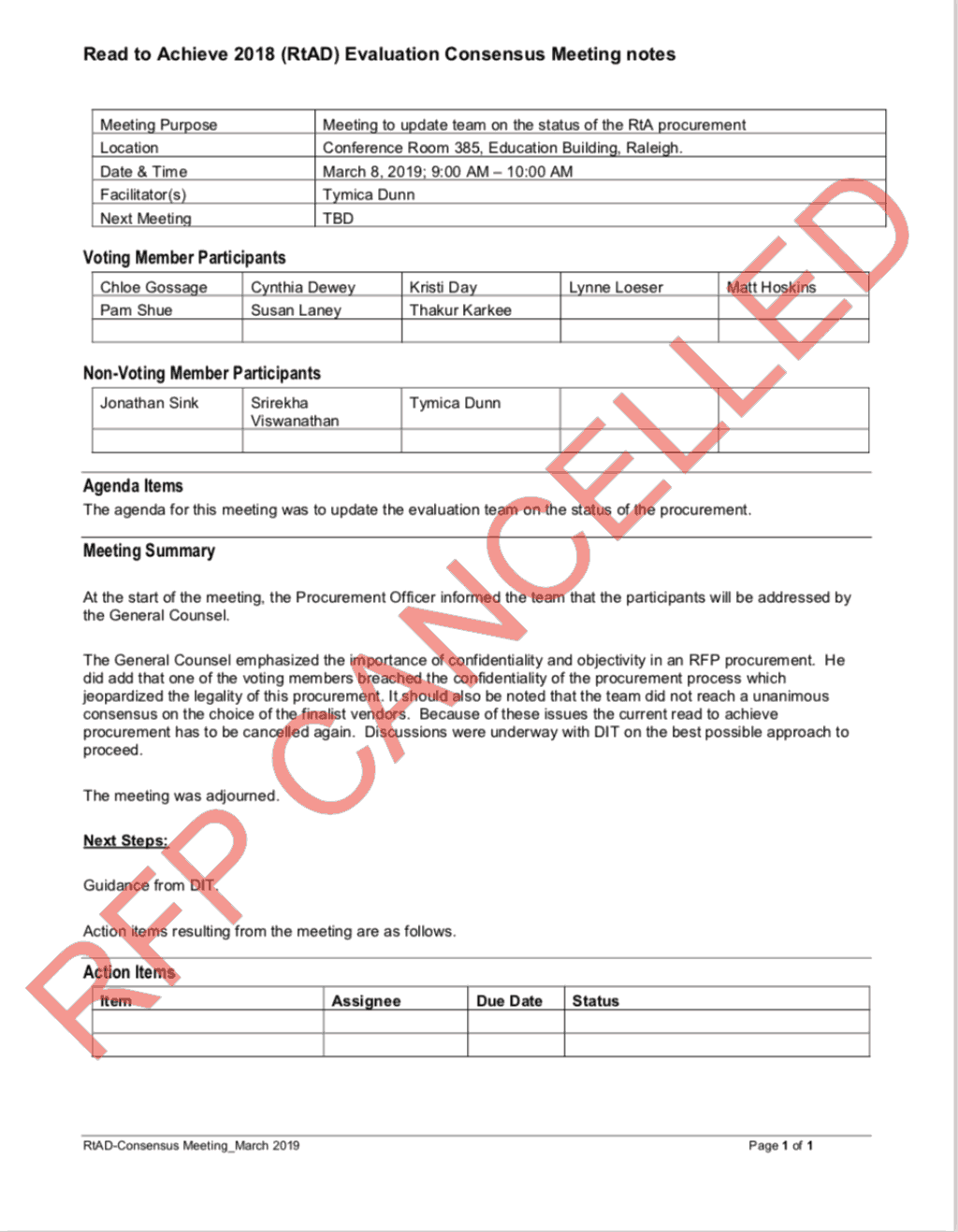 As the large red words printed across these documents note, the RFP process was cancelled in February. Meeting notes from March say then DPI General Counsel Jonathan Sink told the evaluation committee that the process was cancelled because “one of the voting members breached the confidentiality of the procurement process which jeopardized the legality of this procurement.” The next sentence of that document reads: “It should also be noted that the team did not reach unanimous consensus on the choice of the finalist vendors.”