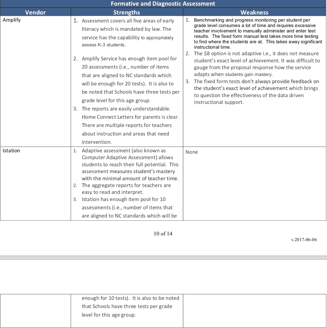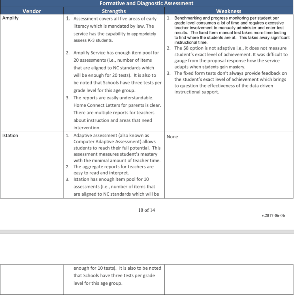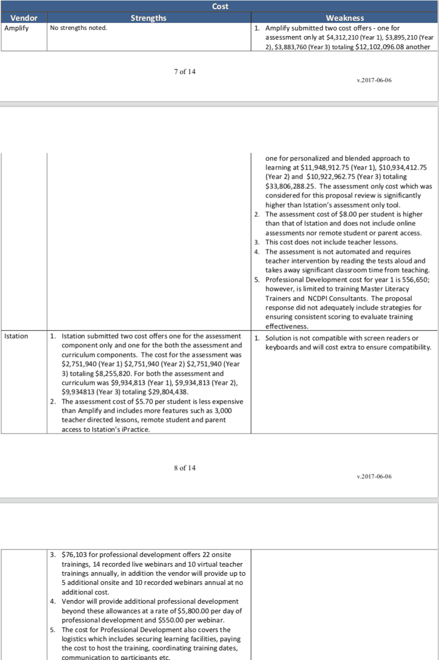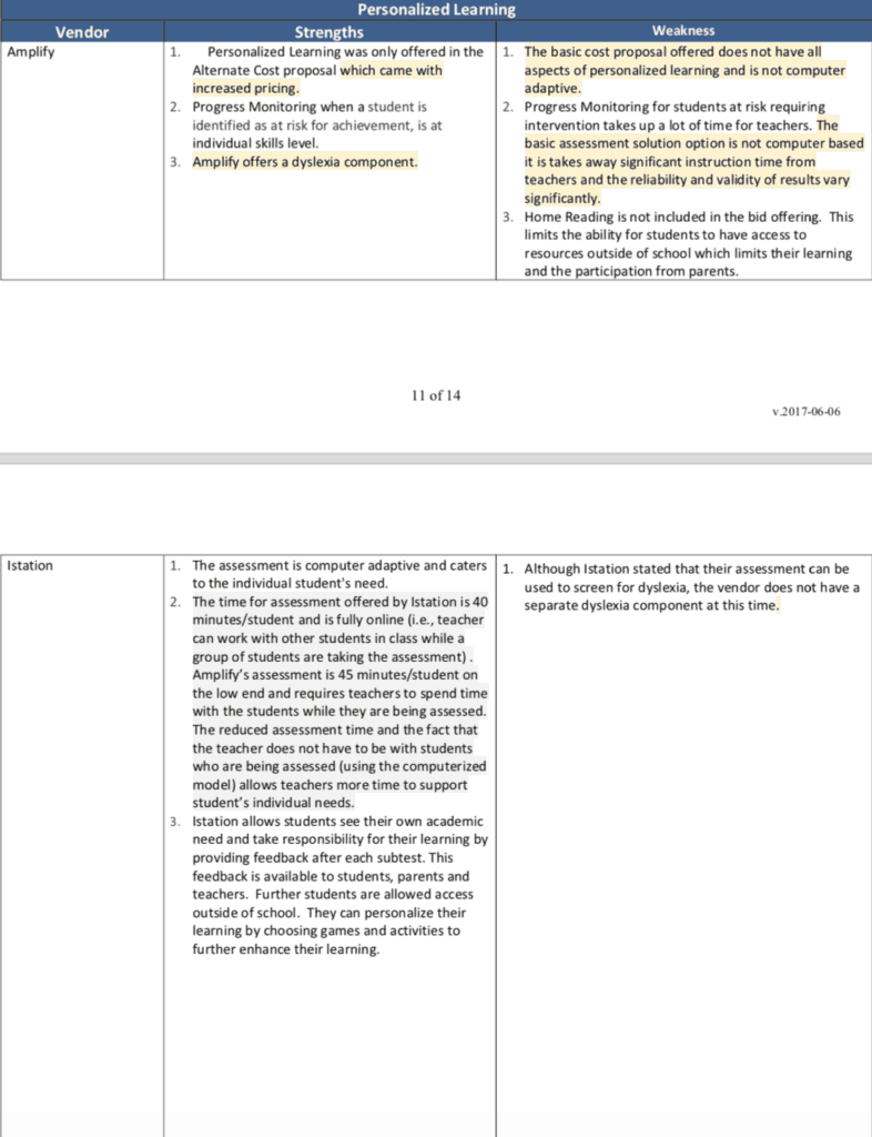 The contract award recommendation includes tables with strengths and weaknesses in each of the areas above (cost, financial stability, formative and diagnostic assessment, and personalized learning.) The team’s main concern seemed to be Amplify’s cost-effectiveness.