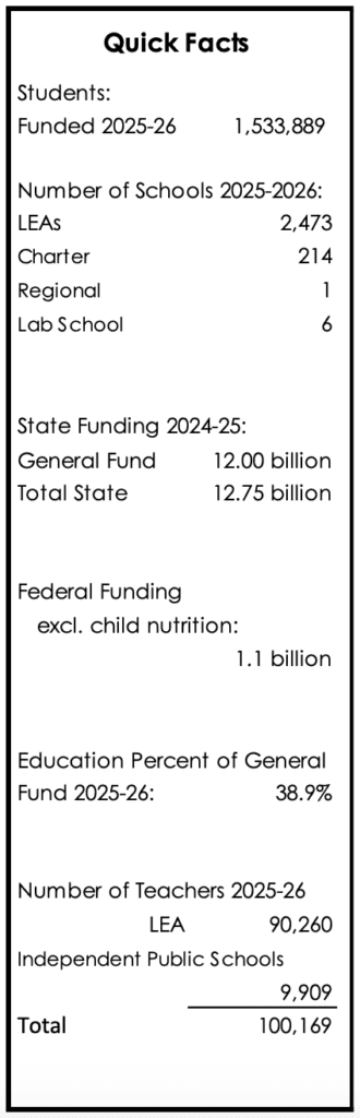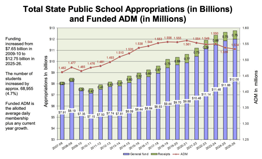 This year’s report shows that while total funding increased from $7.65 billion for public schools in 2009-10 to $12.75 billion in 2025-26, the percentage of public school appropriations in the general budget has slightly decreased over the same time period.