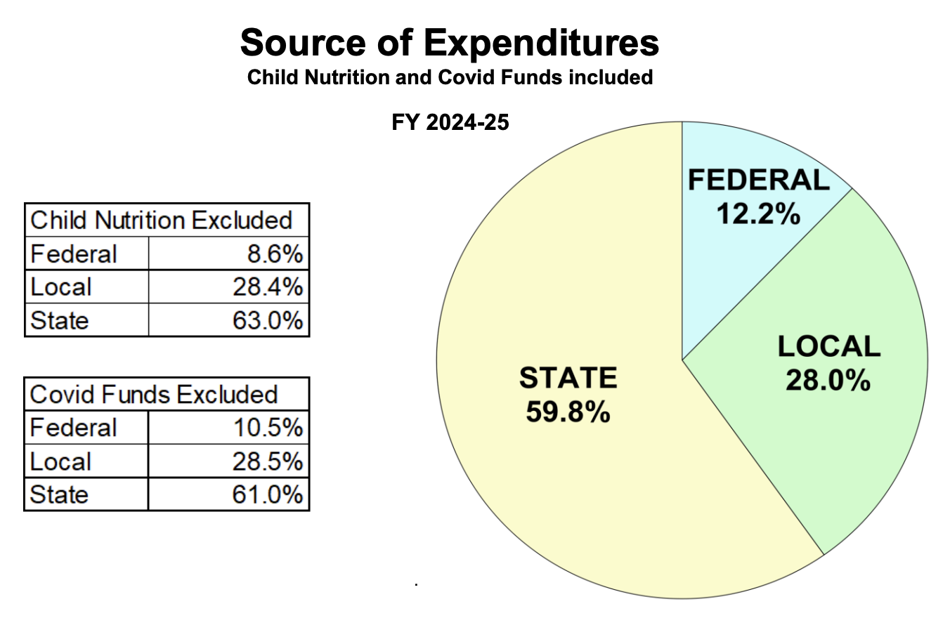 Page 4 shows the percent of expenditures funded by federal, state, and local dollars with and without child nutrition included. This data is for 2024-25.