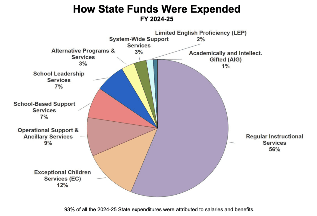 According to the report, 93% of all the 2024-25 state expenditures went toward salaries and benefits. Although salaries represent the largest share of public school budgets, the state has traditionally funded most operational expenses, including salaries, in North Carolina.