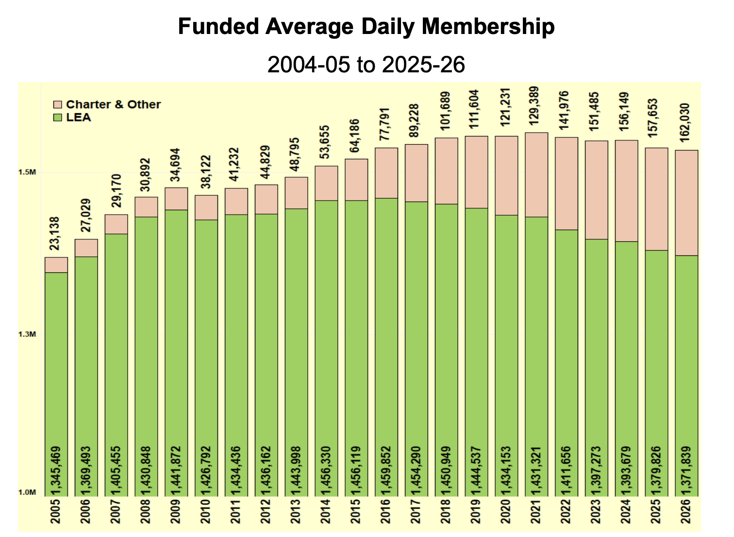There were 1,533,889 students funded and 100,169 teachers across North Carolina schools during the 2025-26 school year, according to the report, reflecting a slight decrease in enrollment, from 1,538,563 students and 100,072 teachers in 2024-25.