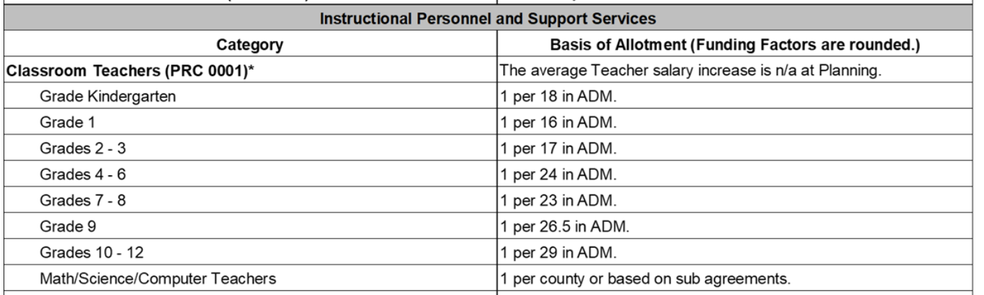 On page 9, you can see the allotment formulas for 2025-26, which also shows the teacher-student ratios for each grade level. You can find more on teacher ratios and class size maximums on page 14.