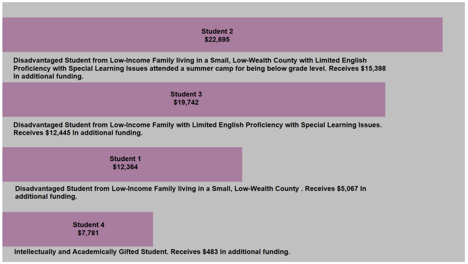- Categorical allotments: “Funding to address differences in student and district characteristics. The funds are to supplement the base funding to provide additional resources, including teachers, for specific populations of students. Categorical allotments include supplemental funds for districts that are low wealth or have a small number of students.” Examples of these allotments include funding for at-risk student services, supplements for low-wealth counties, children with disabilities, and students with limited English proficiency.