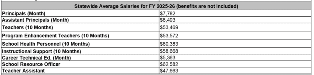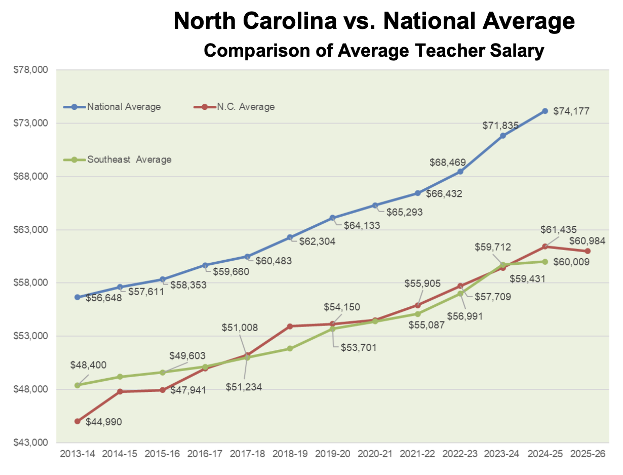 “NEA defines NC average salary as base salary plus supplementary pay. This was $59,971 and $60,323 in 2026 and 2025, respectively,” the report says. “North Carolina ranks 6th in the Southeast in Average Teacher Compensation. Georgia average $71,524 is the highest, with the group average of $60,008 in 2025.”
