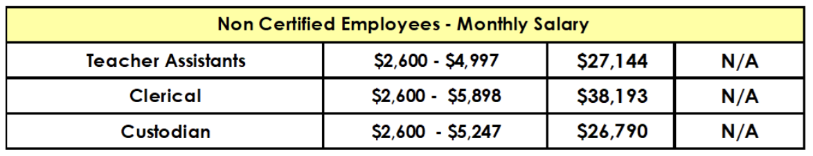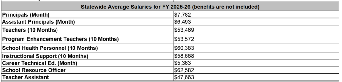 At the bottom of page 9, you can see average salaries for principals, assistant principals, teachers, school health personnel, and others. This figure does not include benefits, which are listed in a different area on the page.