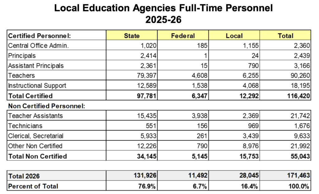 “Teachers, Teacher Assistants, and Instructional Support Personnel make up 75.93% of all personnel,” the report says. “School Building Administrators (Principals & Assistant Principals) make up 3.27% of all personnel. Central Office Administrators make up 1.38% of all personnel. Other Nonprofessionals (Clerical, Technicians, Service Workers, etc.) make up the remaining 19.42% of personnel.”
