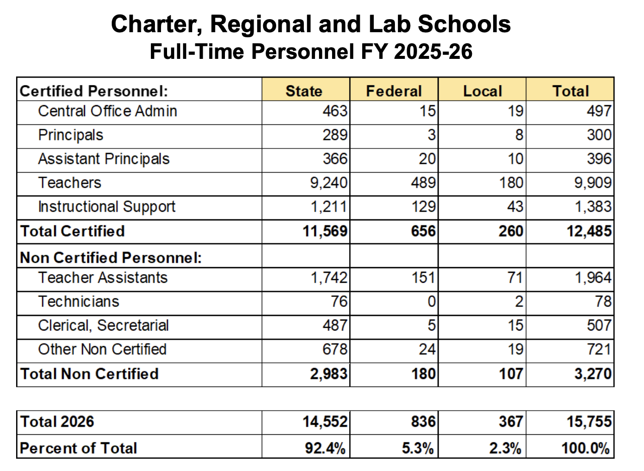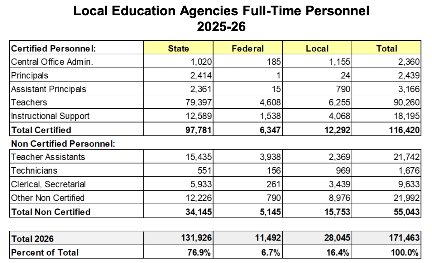Page 15 shows how many principals, teachers, and other educators North Carolina has in 2025-26, and the chart below also shows you how many are paid out of state, federal, and local funds. There is also information on instructional support positions on the bottom of page 15.