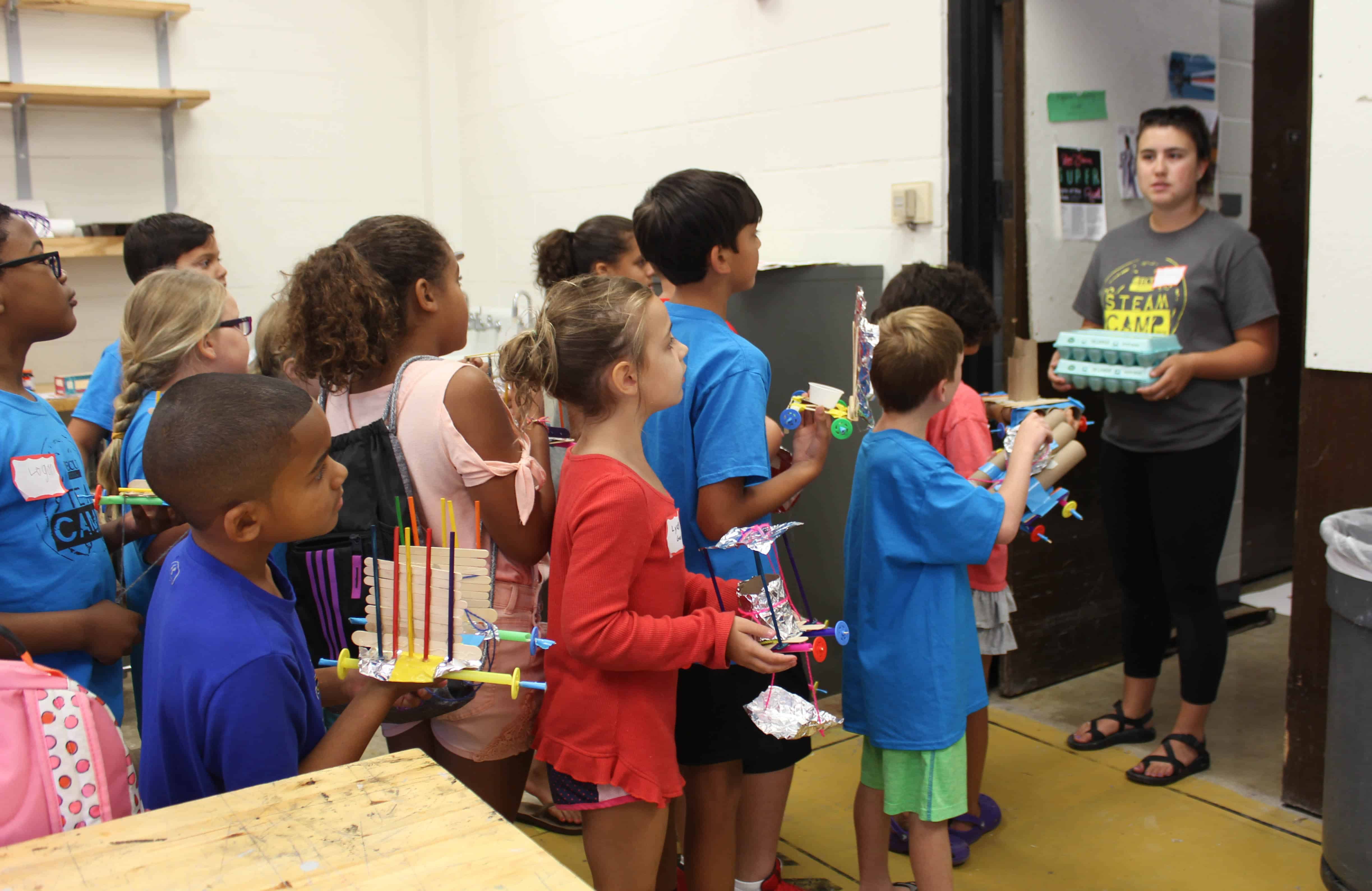 A group of third through fifth graders lined up in front of camp counselor Sydney Gilgo with their egg crash test carts in hand. They were ready to test their creations — if successful, the carts would roll down a ramp while keeping the egg from falling and breaking.