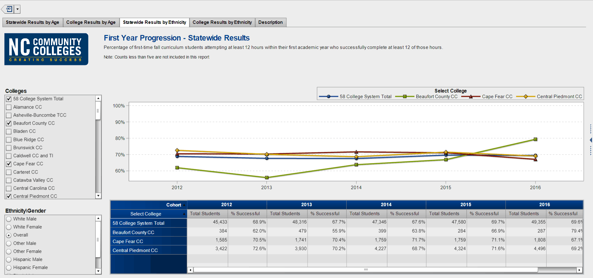 All of the data available online are aggregated at the college level. However, you can disaggregate the data based on gender and ethnicity, allowing stakeholders insight into how different student groups are performing at each college and revealing achievement gaps between these groups.