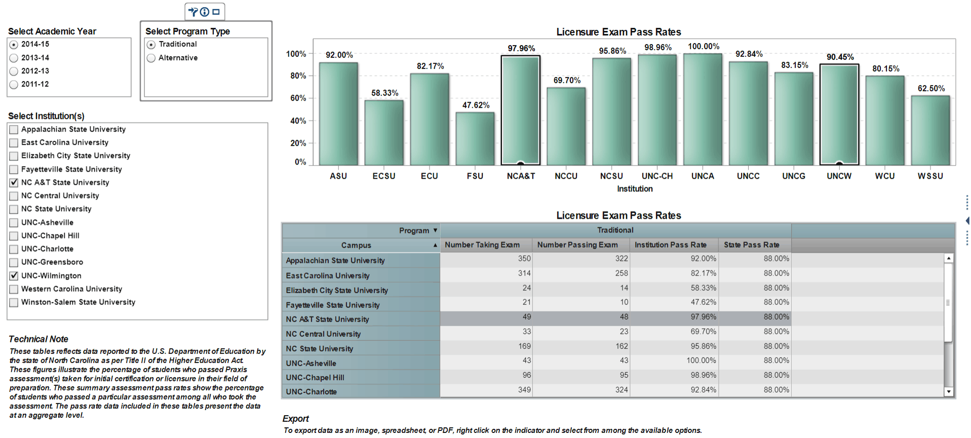 The UNC Educator Quality Dashboard was designed to “strengthen, focus, and enhance” UNC’s 15 educator preparation programs and provides data and information on teachers and school leaders from each of them. The dashboard, developed in partnership with SAS, was launched in 2015 by the UNC System Office to provide the public with an interactive way to consume and analyze data on the quantity and quality of educators across the state.
