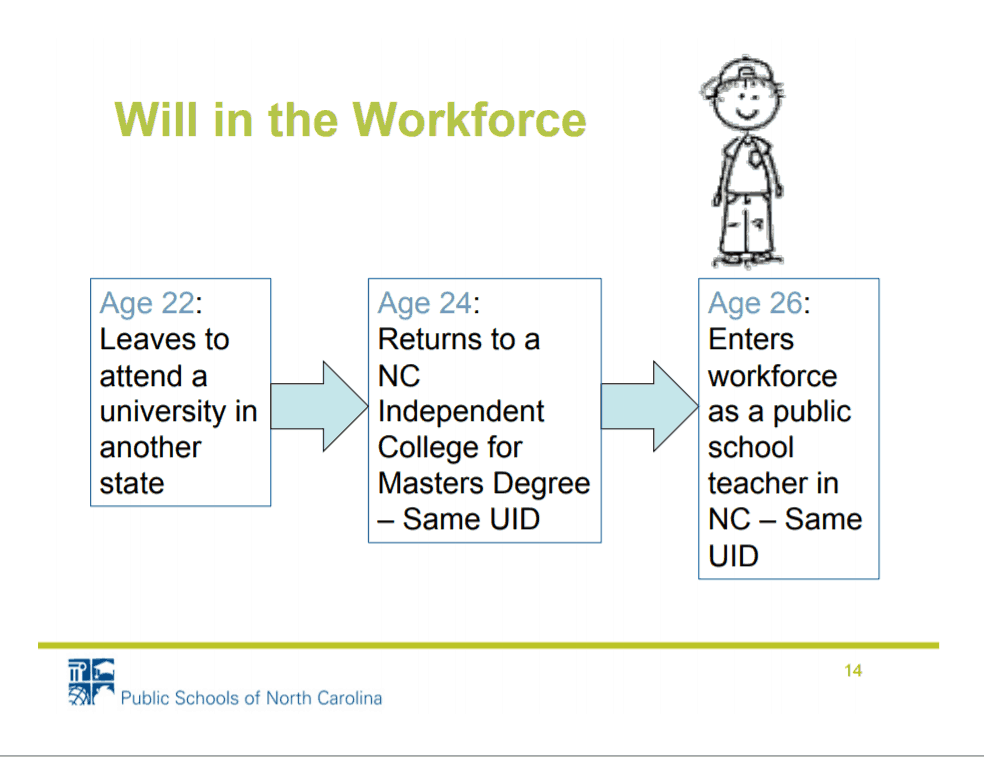 As with CEDARS, these UID’s remain connected to that unique student throughout his progression through the different systems, even if he leaves and re-enters at a later point. Despite the ability to link individual student and staff data over time, NC SchoolWorks is not designed to provide information on individuals. Rather, it’s designed to produce data on cohorts of students, schools, and programs over time. The use of the UID system ensures no names, social security numbers, or contact information is tracked. For example, a researcher can’t request data on Emily — but he or she could request data on the attainment and eventual earnings of all students from Emily’s elementary school in a given set of years.