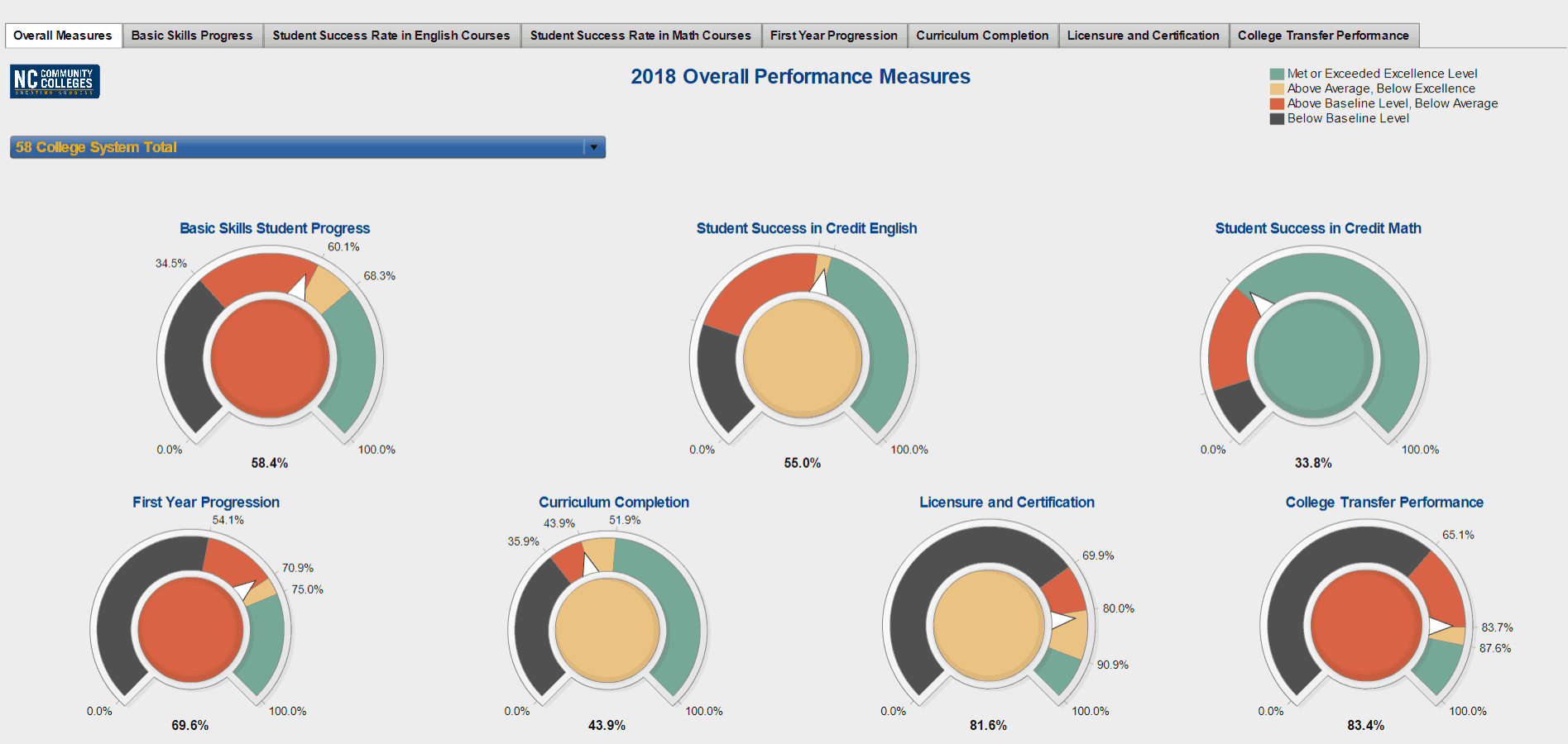 State Performance Measures: Adopted by the General Assembly and reviewed every three years, State Performance Measures are the accountability metrics used by the NC Community College System to assess the performance of the system’s 58 colleges. The Performance Measures for Student Success Report is published annually online as a PDF and hosted in an interactive portal by SAS. These measures include first year progression and college transfer performance, among other things.