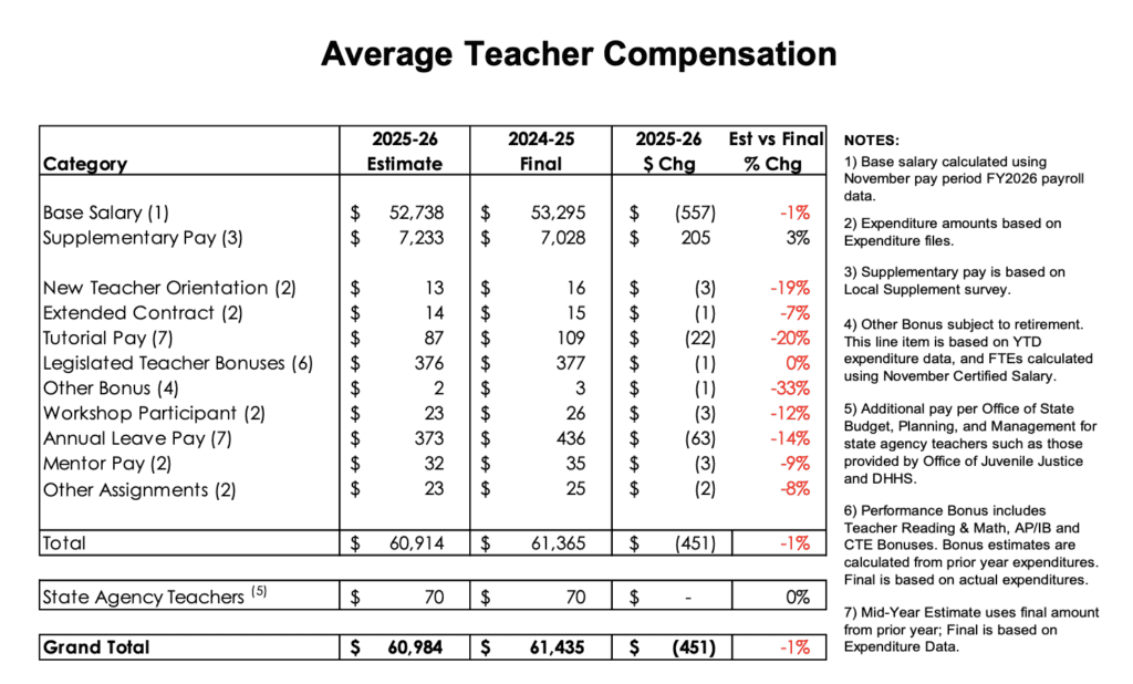 BEST NC, a nonprofit business leader coalition focused on education, found that average teacher pay was $58,292 in 2023-24 and average starting pay was $40,136 in 2022-23. According to the Department of Public Instruction’s (DPI) latest “Highlights of the North Carolina Public School Budget” report, average teacher salaries as defined by the National Education Association — base salaries plus local supplemental pay — were $59,971 in 2026 and $60,323 in 2025. After including bonuses, the estimated average compensation for 2025-26 was 1% lower than 2024-25.