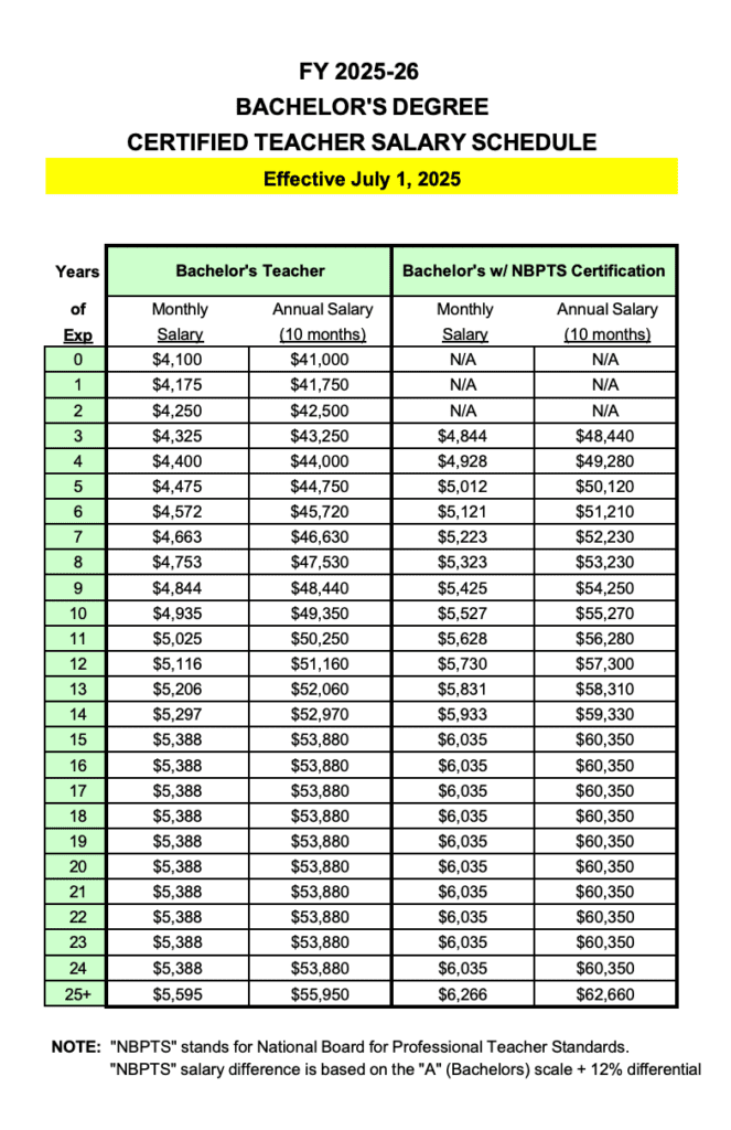 That strategy remains, as certified teachers with a bachelor’s degree see yearly pay increases through the first 15 years of their career. Base pay in the schedule currently starts at $41,000 for new teachers, rises to $53,880 by year 15, then increases once more to $55,950 at year 25.