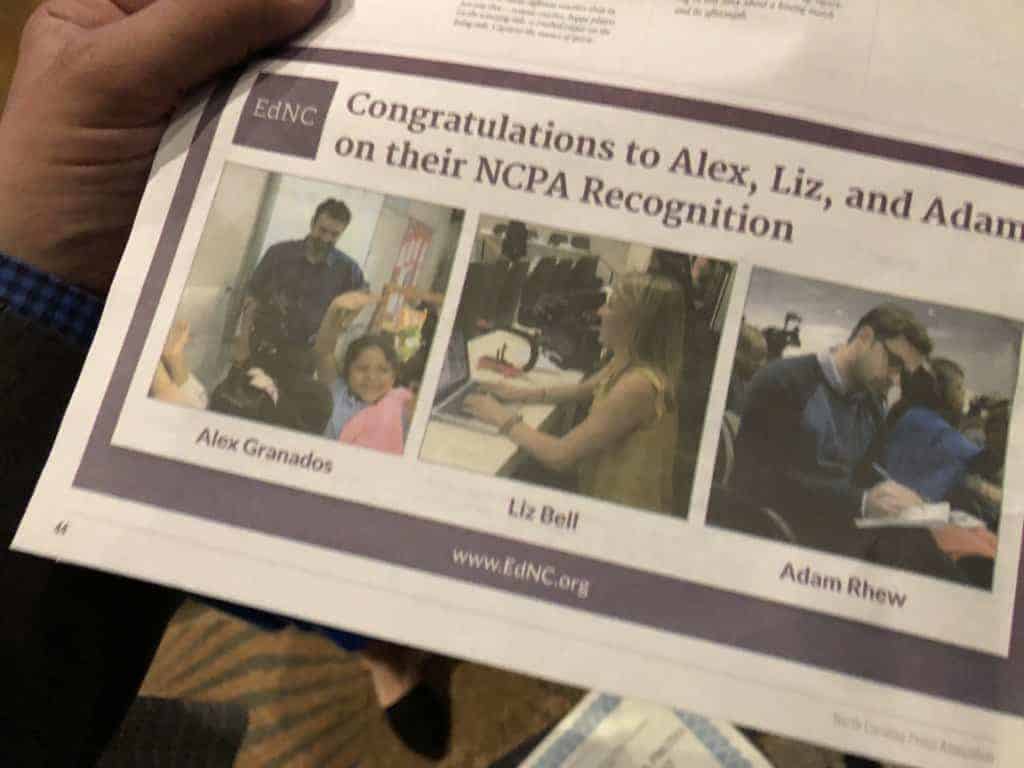 The conference culminated in an awards banquet where EdNC was honored to receive five awards. Three reporters received individual honors, highlighted below, but our entire staff took the stage to receive them — a visual reminder of our dedication to the concept of teamwork and our belief that each member is crucial to our collective success.