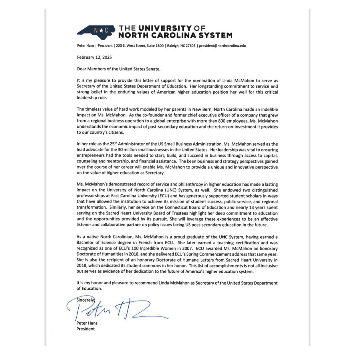 UNC System President Peter Hans supports Linda McMahon for Secretary of the U.S. Department of Education