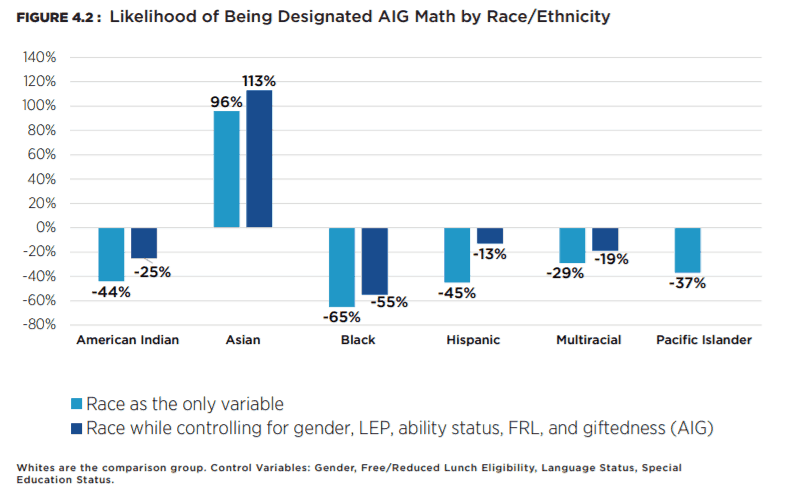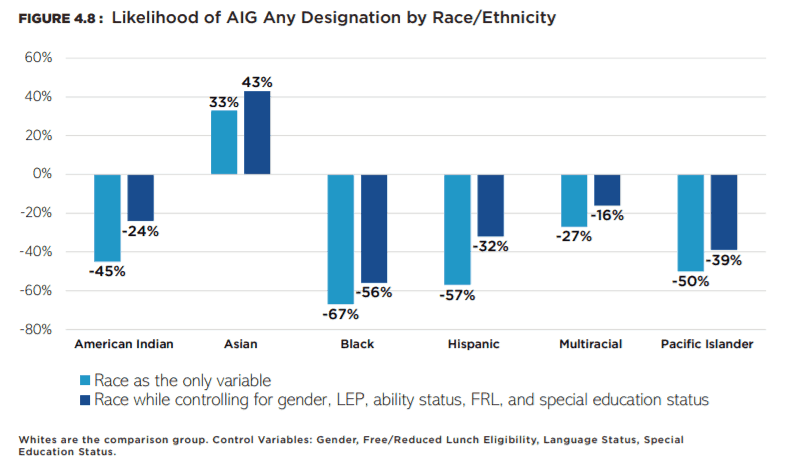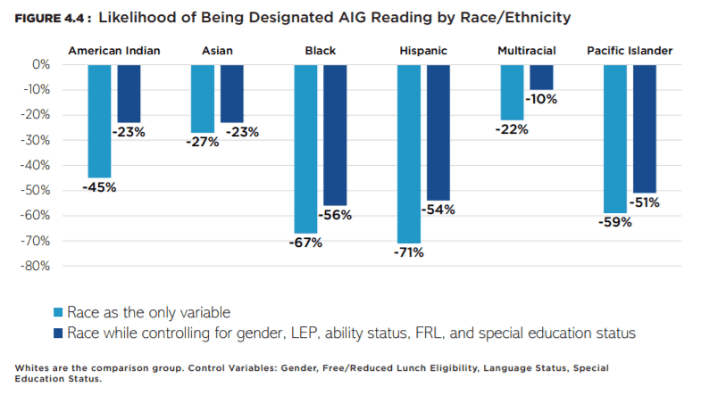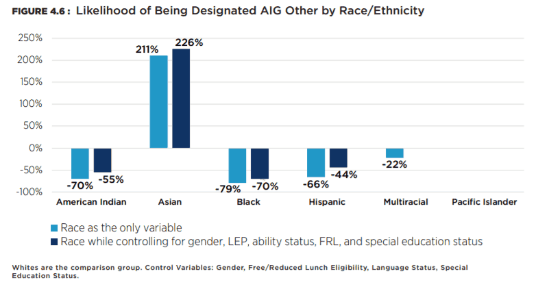 There are clear patterns of racial disparity across all three AIG designations. In both AIG Math and AIG Other, Asian and White students are over-represented in comparison to their percentage of the state student population. American Indian, Black, and Hispanic students are under-represented in both AIG Math and AIG Other. In AIG Reading, Asian, White, and Multiracial students are over-represented, and all other groups are under-represented in comparison to their proportion of the total state student population. The degree of negative disparity for American Indian and Black students holds across all AIG designations. Furthermore, race/ethnicity is a significant and substantial predictor of differential AIG designations net of all other relevant factors.