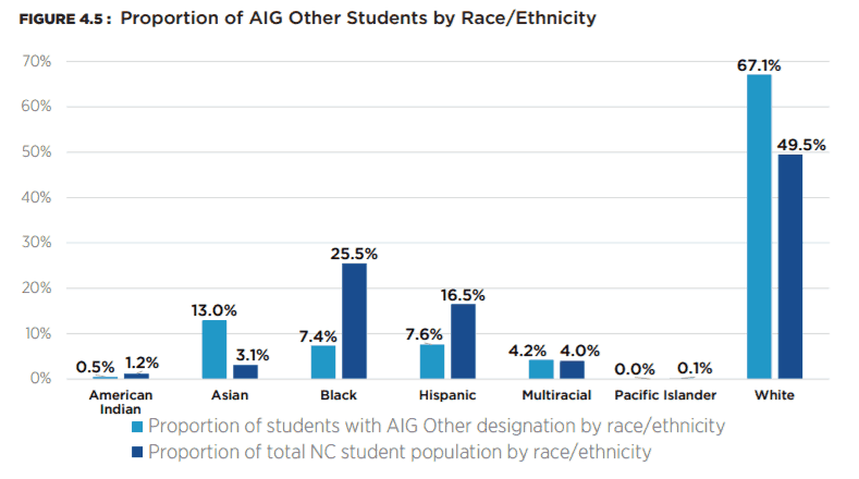 The AIG Other designation means students have been evaluated and selected by their LEA as intellectually or academically gifted in ways that fall outside the traditional math or reading designations. Figure 4.5 shows the proportion of students designated AIG Other by race/ethnicity.