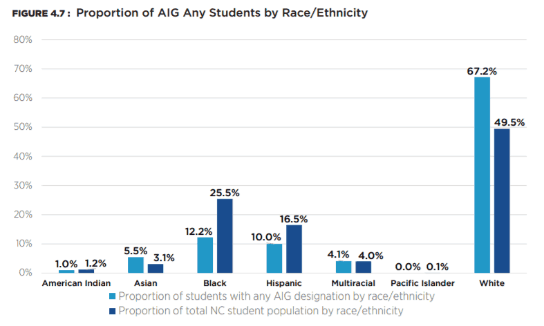 What oversight exists beyond review of AIG plans is unclear. While the NC AIG Program Standards do not position racial equity in AIG as an explicit goal, they do affirm that: “[o]utstanding abilities are present in students from all cultural groups…” and charge LEAs with ensuring that “AIG screening, referral, and identification procedures respond to under-represented populations of the gifted…” (NC State Board of Education, 2018, p. 1, 2).