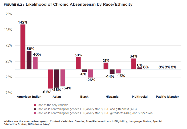 Overall, several conclusions flow from our analysis of chronic absenteeism. First, given their consistently higher odds, American Indian students appear to be uniquely exposed to a higher incidence of chronic absenteeism in comparison to other racial/ethnic groups. Secondly, White students as a racial/ethnic group appear to face significant challenges with chronic absenteeism. Third, although Black, Hispanic, and Multiracial students are over-represented in chronic absenteeism in comparison to their percentage of total student population, race/ethnicity does not appear to increase their odds of chronic absenteeism after controlling for other factors, particularly FRL status and special education status. Finally, our results suggest a powerful relationship between out-of-school suspension and chronic absenteeism across all student groups that warrants further empirical investigation. However, it suggests that policies and procedures intended to reduce the incidence of exclusionary discipline might also help diminish chronic absenteeism and the compounded effect of both on students’ educational outcomes.