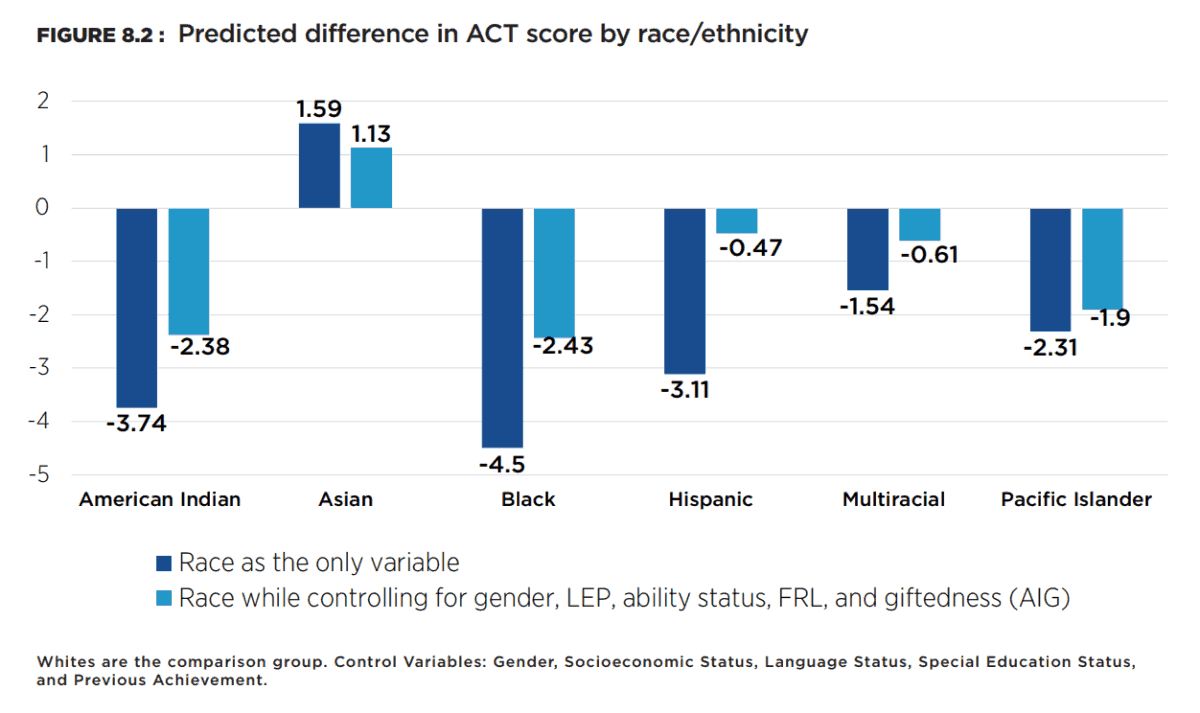 Net of other factors in the model, Asian students were predicted to score 1.13 points higher than their White counterparts. All other student groups of color were predicted to have lower ACT scores compared to Whites. The magnitude of racial disparity was highest for Black students, who were predicted to score 2.43 points lower than Whites, followed by American Indians (2.38 points lower), Pacific Islanders (1.90 points lower), Multiracial students (0.61 points lower), and Hispanics (0.47 points lower). Of all the predictors in the model (race/ethnicity, gender, socioeconomic status, language status, special education status, and previous achievement), only previous achievement, as measured by overall GPA in 11th grade, was a stronger predictor of ACT score than race/ethnicity after controlling for other factors.