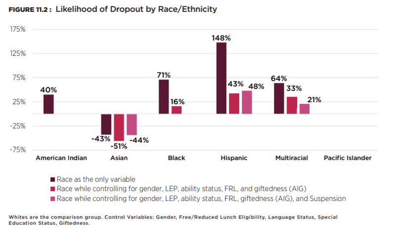 In Model 2, which controlled for gender, Limited English Proficiency, special education status, giftedness, and eligibility for free/reduced lunch, the model predictions remained largely unchanged for Asians and Pacific Islanders as compared to Whites. American Indian students were no longer significantly different from Whites. The likelihood of dropout for Black (16%), Hispanic (43%), and Multiracial (33%) students remained higher than those of Whites, although the magnitude dropped substantially.
