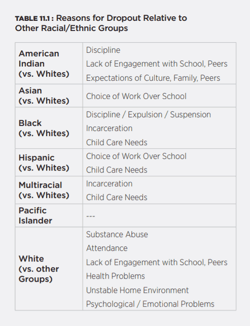 As compared to Whites, school discipline and the criminal justice system (incarceration) factor prominently in the reasons for American Indian, Black, and Multiracial students dropping out. The choice of work over schools appears to precipitate dropout among Asian and Hispanic students as compared to Whites. The need for childcare is a factor for Black, Hispanic, and Multiracial students versus their White counterparts. American Indians report a lack of engagement with peers and the expectations of culture, family, peers more often than Whites.