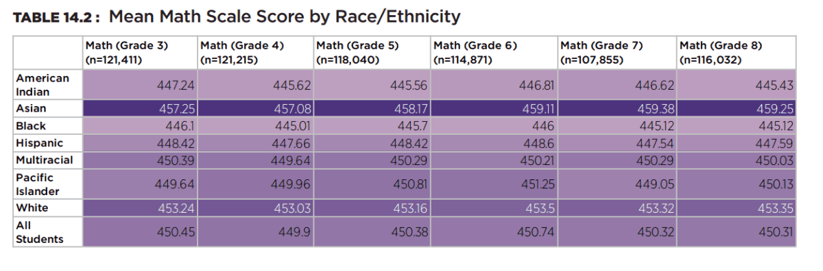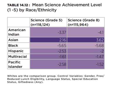 Results for predicted achievement level follow a now well-established pattern. Asians outperform all students. Whites outperform all non-Asian student groups of color. Hispanic, Multiracial, and Pacific Islander students perform below Whites and Asians, but vary by subject area when compared to each other. American Indian and Black students were predicted to consistently perform below all other groups, and predicted achievement levels for Black students were the lowest on every assessment.