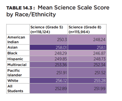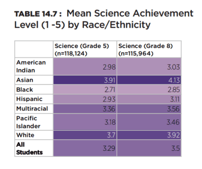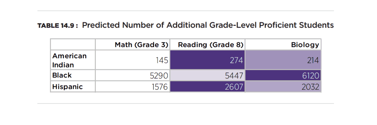 The same pattern observed in scale scores also applies to achievement level, with students’ racial/ethnic groups stratified into bands such that Asian and White students have the highest scores and score above the state average on all assessments. Multiracial and Pacific Islander students hover at the state average and without exception score higher than American Indian, Black, and Hispanic students. Black students have the lowest mean achievement level on all assessments. Table 14.9 shows the predicted number of additional American Indian, Black, and Hispanic students that would be grade-level proficient if those groups were to perform at the current statewide average in 3rd grade math, 8th grade reading, and biology.