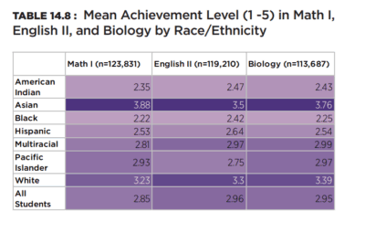 Tables 14.5, 14.6, 14.7, and 14.8 present EOG/EOC mean achievement level (1 – 5) by race/ethnicity. The state deems a score of 3 or higher to mean students are proficient in that subject.