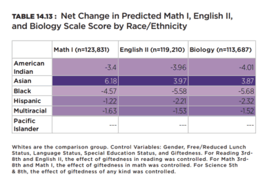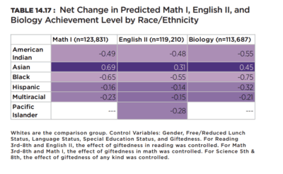 Given the strength of race/ethnicity as a factor in EOG/EOC performance, along with the consistency of the effect in terms of direction and magnitude, it is difficult not to conclude that powerful, institutional factors are at play in the observed results. If we were to accept that some racial/ethnic groups begin school “behind,” which we do not, the strong effect of race/ethnicity on elementary math for instance might be partially understood. However, such explanations become untenable when observed patterns persist through middle and high school. Recall that being Black is a stronger predictor of achievement level in 8th grade science than being academically gifted. Overall, explanations related to the systemic inequities in access and opportunity found across numerous indicators elsewhere in this report appear to be much more plausible in explaining highly stratified racial/ethnic results in EOG/EOC scores and achievement levels.