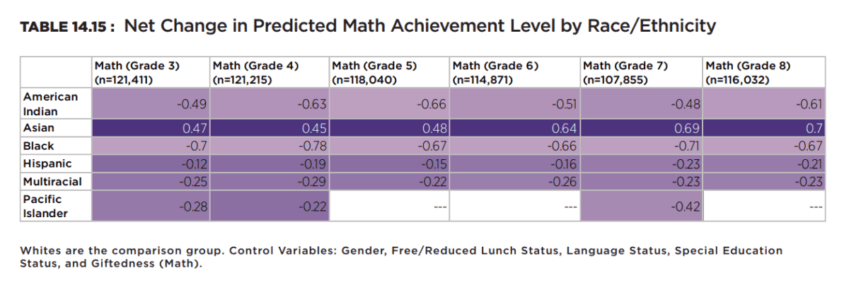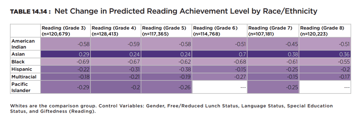 The figures listed in the tables below represent the predicted net change in achievement level for each student group of color as compared to White students while controlling for other relevant factors.