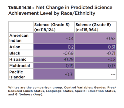 Tables 14.10, 14.11, 14.12, and 14.13 present the results of the prediction models. The figures listed represent the predicted net change in scale score for each student group of color as compared to White students while controlling for those factors.