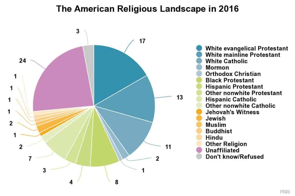 In North Carolina, PRRI found the top religious groups are white evangelical protestants (28 percent), unaffiliated (19 percent), and then a tie between white mainline protestants and black protestants (14 percent each).1
