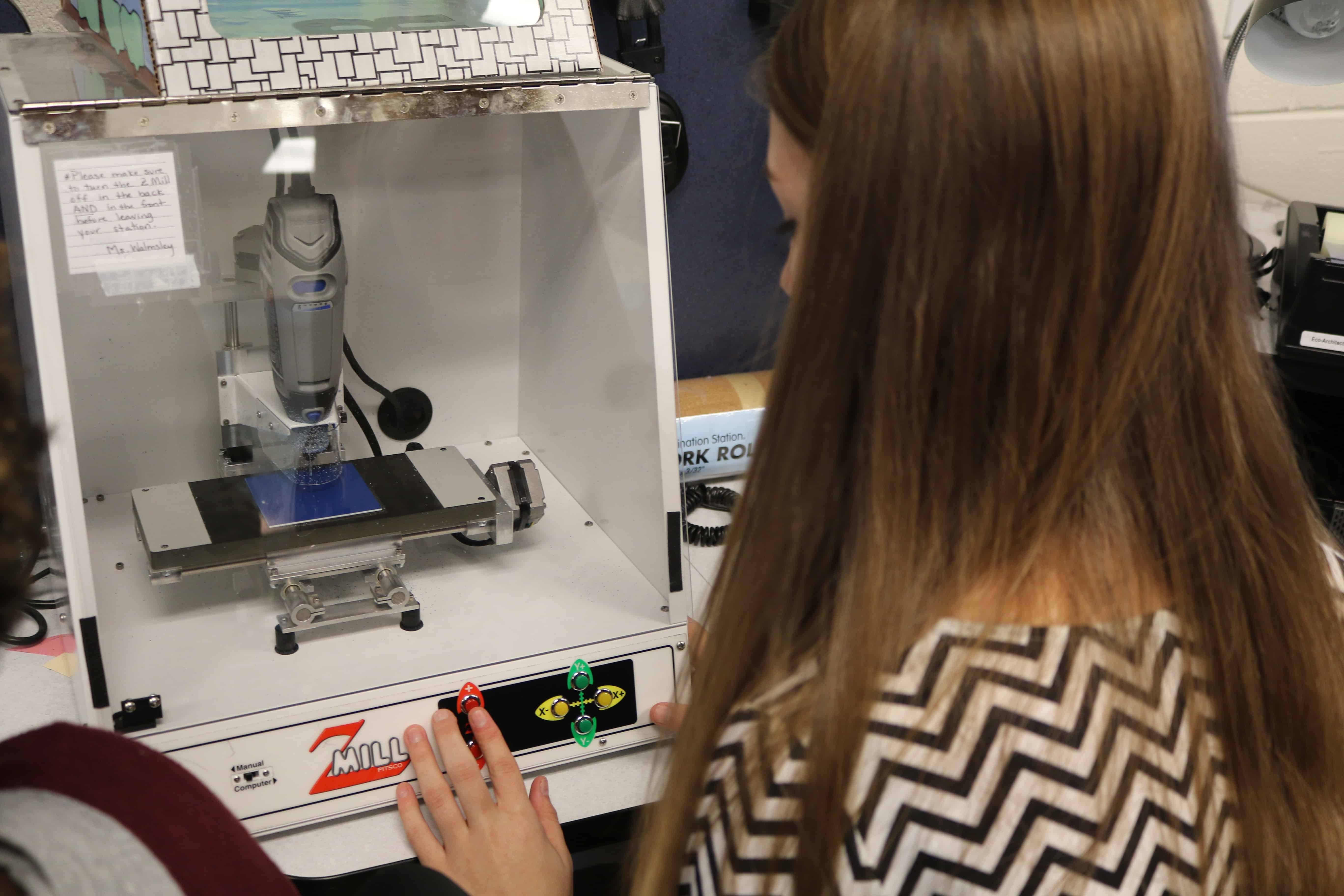 Meredith Warren, a middle school ambassador, demonstrated how to use a small machine called a Z-Mill, which can be used manually or programmed to move in a certain pattern. Walmsley proudly showed her students’ progress — the improvement once students went from operating the machine manually to being able to program.