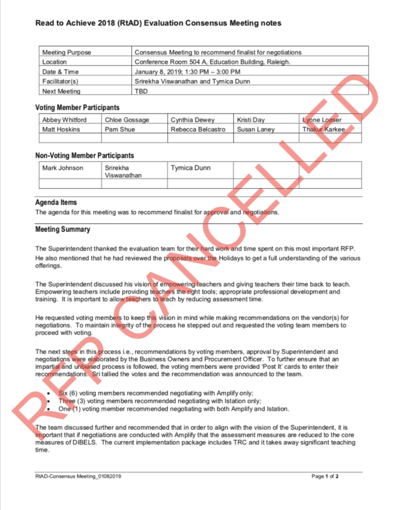 Before a final evaluation panel chose Istation, a larger evaluation team met and evaluated four bidders in November 2018, ranking Amplify as its first choice and Istation as its second. Meeting documents from the team’s next meeting in January 2019 show the team voting, with six recommending Amplify, three recommending Istation, and one recommending moving forward in the process with both companies.