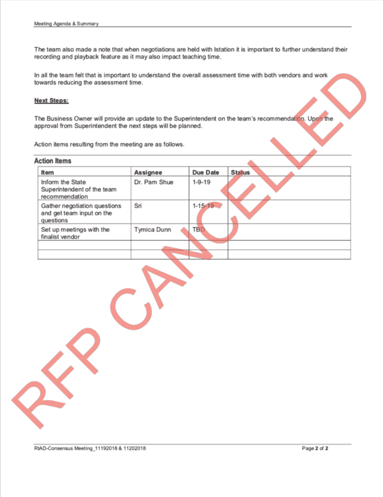 DPI canceled the procurement process in February 2019 and told DIT, which was overseeing the procurement, that the costs were so far apart that direct negotiations were necessary. From those direct negotiations with Amplify and Istation, Istation came out on top.
