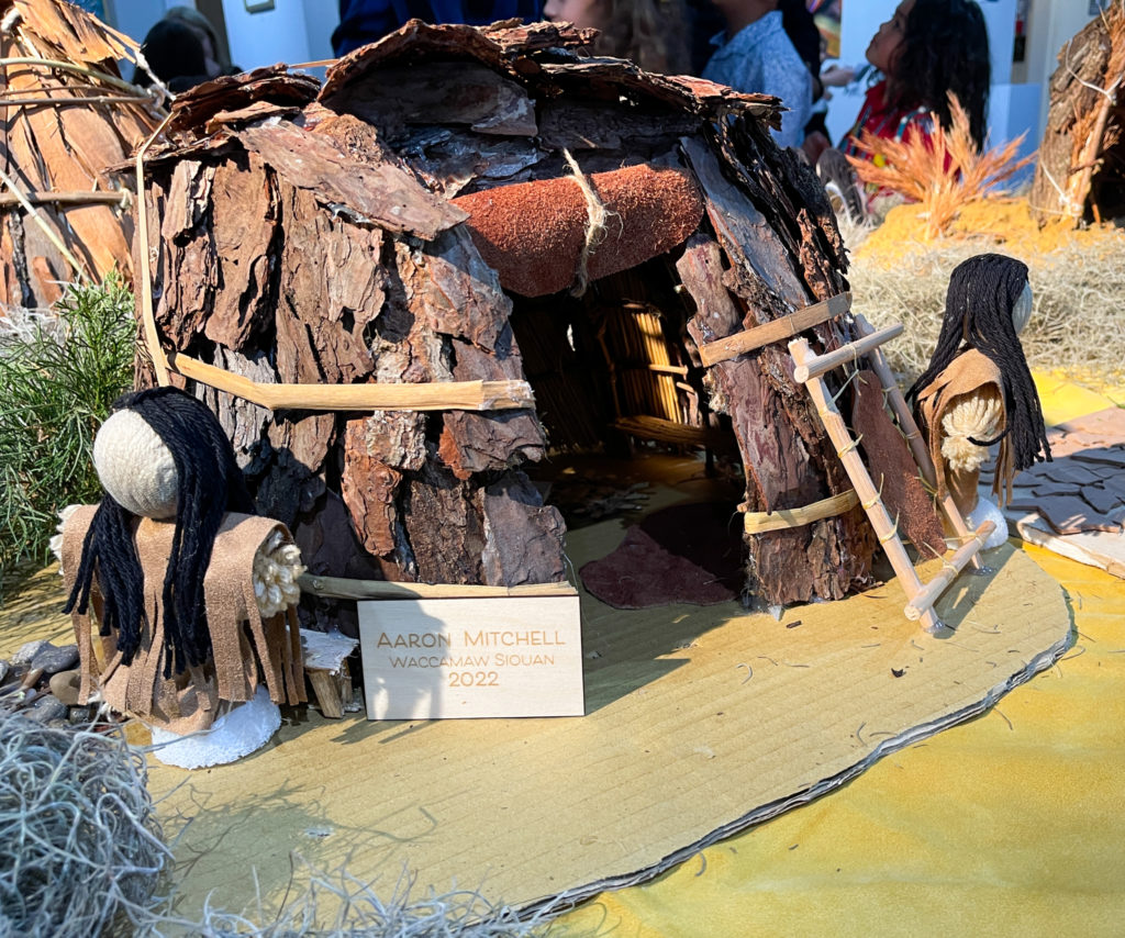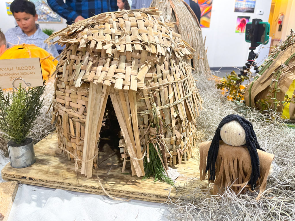 Students used materials like grapevines, tree branches, and bark. Several wigwams were interactive, including one that replicates a “damper” on the top and a string that you pull down.