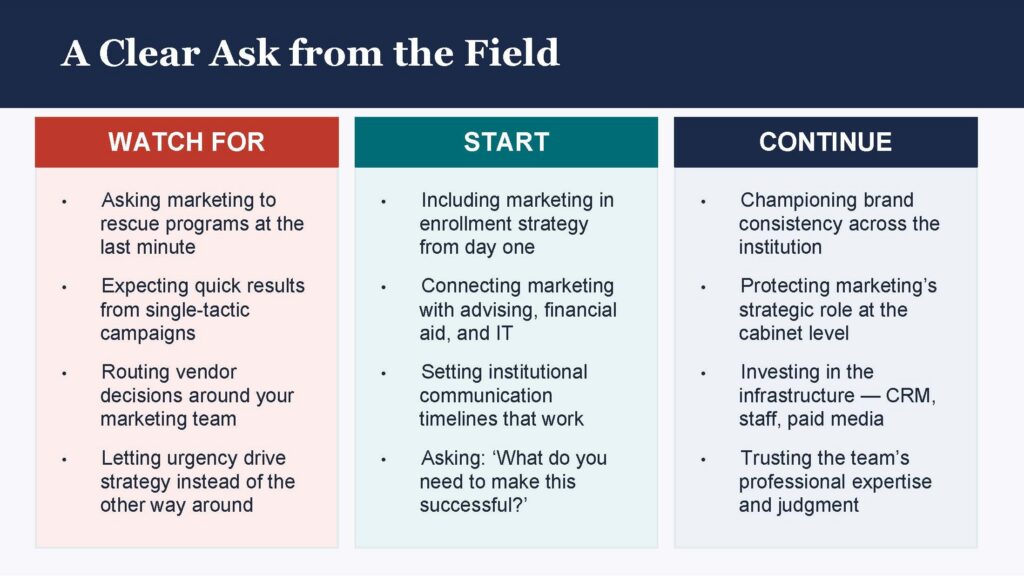 - Include marketing at the table early. Institutional strategy should shape messaging, not the other way around.