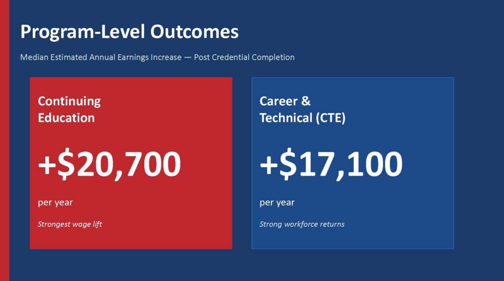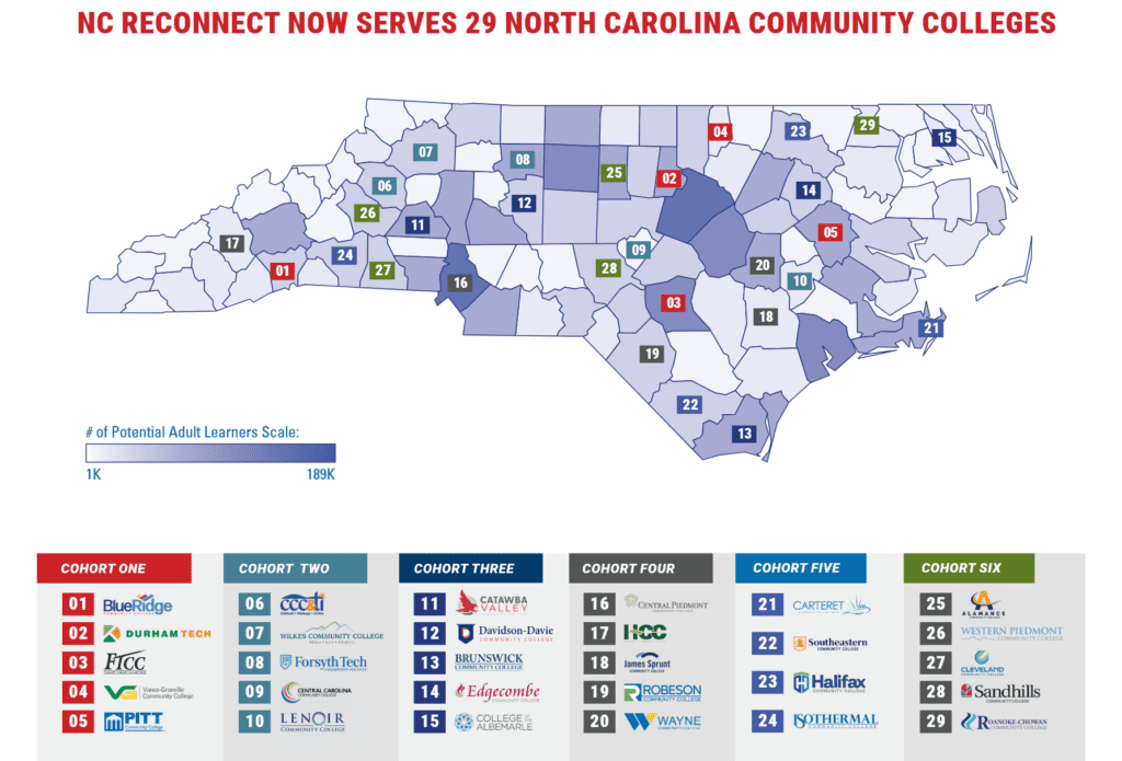 - Colleges can communicate the high return on investment, such as the $17,100 wage increase for NC Reconnect CTE credential completers, to address adult learners’ desire for short-term upskilling.
