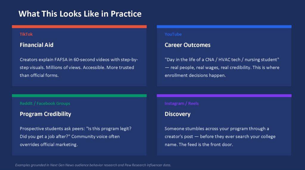 In practice, Kellett’s recommendation is to create an internal and external team of creators who can help build and communicate community colleges’ messages. This could include faculty, administrators, college presidents, and students. But, he said, community colleges can also identify and co-create their own database of trusted creator partners.