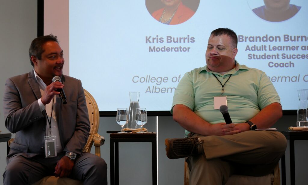 Brandon Burnett, a former adult learner and student success coach at Isothermal Community College, joined Bacud in sharing his story during the convening’s opening panel. His journey, like Bacud’s, represents the resilience adult learners demonstrate daily at community colleges across the state.